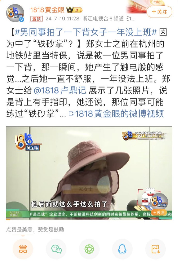 杭州一女子遭男同事轻拍背部后,坚信自己身中“铁砂掌”,竟因此停职一年。
