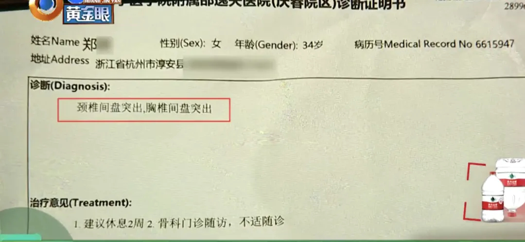 郑女士还透露,班长之前开玩笑称自己练过铁砂掌,这句话让她耿耿于怀。半个月后,郑女士去医院检查,称自己颈椎间盘突出,胸椎间盘突出,治疗意见是休息两周。