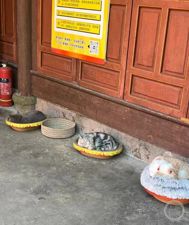 作为“铲屎官”,杨小姐自然没有放弃与猫互动的机会,她投喂了现场的小猫,还发现了一个有趣细节:“我看到庙里的墙角贴了一些脾气不好猫咪的照片,还有注意事项,提醒大家不要去摸它们。当然,我本身就养猫,对此并不担心,而且我发现现场准备有肥皂。如果被(猫)抓伤,用肥皂清洗15分钟就好了。”