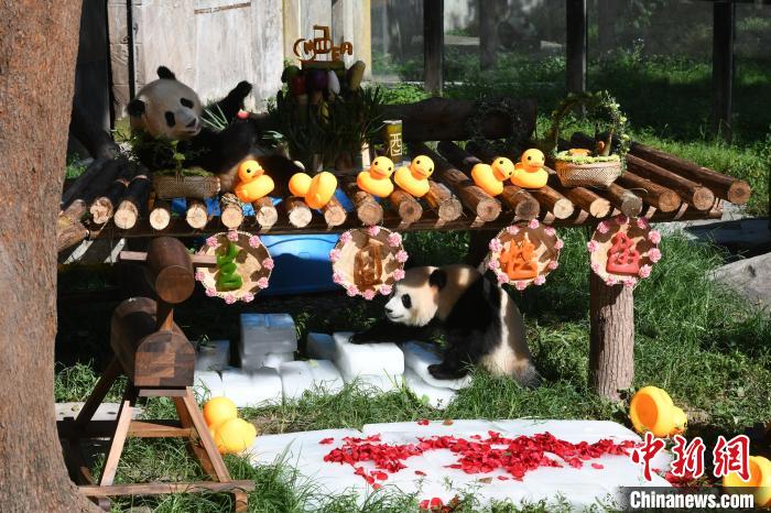 7月22日,重庆动物园为大熊猫双胞胎兄妹“渝可”“渝爱”举办2周岁生日会。 中新社记者周毅摄