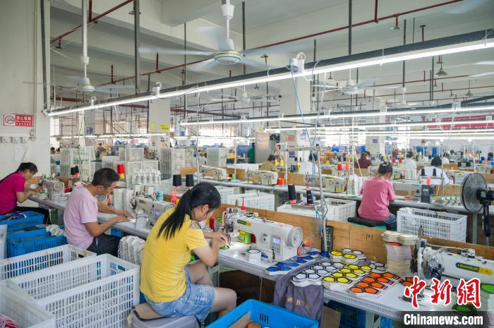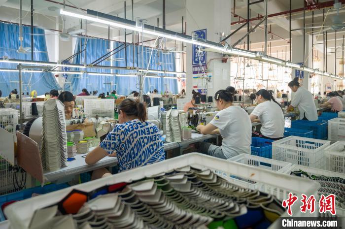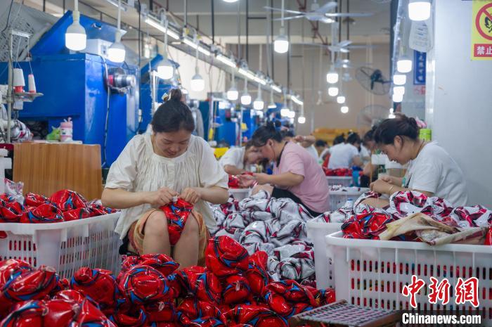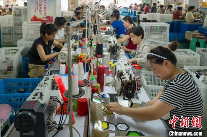 7月22日,贵州省遵义市务川仡佬族苗族自治县大坪工业园区内的一家体育用品生产企业车间,300余名工人正在忙着生产订单足球供应市场,企业生产车间内一派繁忙景象。图为工人们在缝合足球。 中新社记者唐哲摄