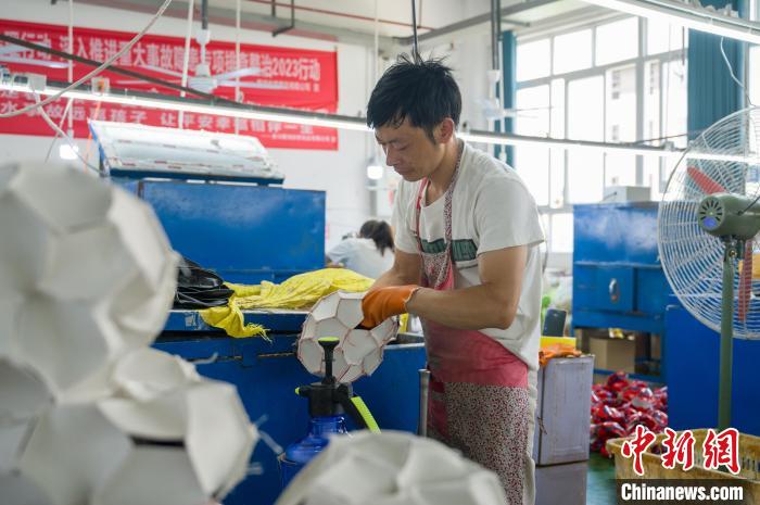 7月22日,贵州省遵义市务川仡佬族苗族自治县大坪工业园区内的一家体育用品生产企业车间,300余名工人正在忙着生产订单足球供应市场,企业生产车间内一派繁忙景象。图为一名工人在足球装胆。 中新社记者唐哲摄