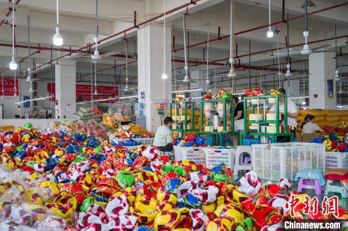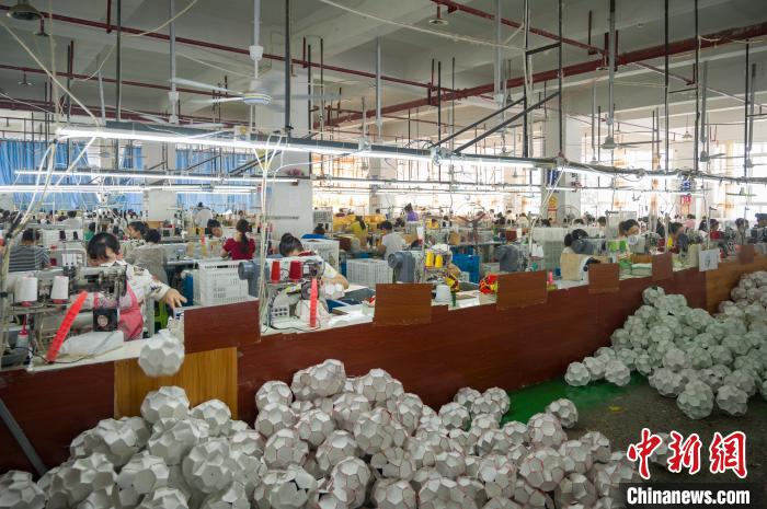 7月22日,贵州省遵义市务川仡佬族苗族自治县大坪工业园区内的一家体育用品生产企业车间,300余名工人正在忙着生产订单足球供应市场,企业生产车间内一派繁忙景象。图为工人们在拼接足球。 中新社记者唐哲摄