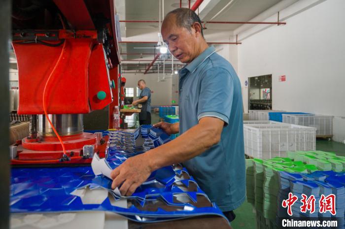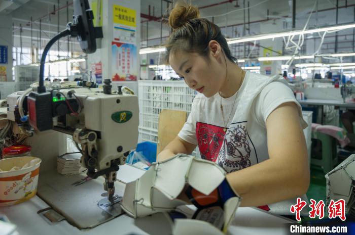 7月22日,贵州省遵义市务川仡佬族苗族自治县大坪工业园区内的一家体育用品生产企业车间,300余名工人正在忙着生产订单足球供应市场,企业生产车间内一派繁忙景象。图为一名工人在拼接足球。 中新社记者唐哲摄