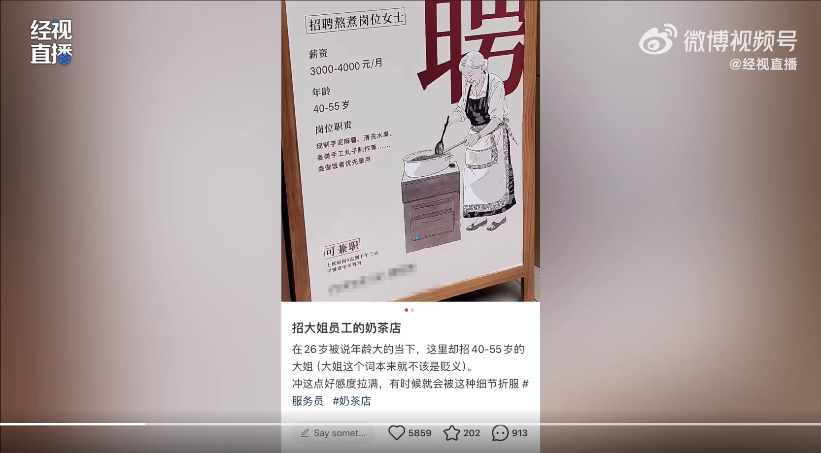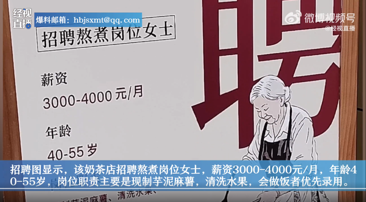 近日,安徽合肥,有网友在社交平台上发了一张奶茶店招聘图,并写道,在26岁被说年龄大的当下,这里却招40-55岁的大姐,冲这点好感度拉满。招聘图显示,该奶茶店招聘熬煮岗位女士,薪资3000-4000元/月,年龄40-55岁,岗位职责主要是现制芋泥麻薯,清洗水果,会做饭者优先录用。在图片下方还写了一行字,可兼职,上班时间九点到下午三点。