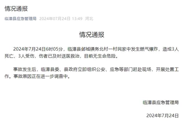 据临漳县应急管理局通报,2024年7月24日6时5分,临漳县邺城镇务北村一村民家中发生燃气爆炸,造成3人死亡、3人受伤,伤者已及时送医救治,目前无生命危险。