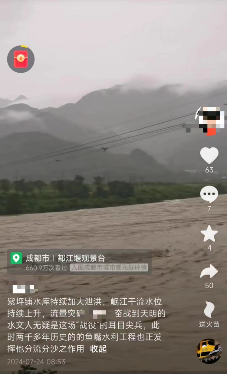 都江堰景区附近的雷先生(化名)在7月24日上午8点左右发布了一段都江堰鱼嘴的视频,从视频来看虽然鱼嘴已经被洪水淹没,但是分流的效果还是很明显。记者私信了雷先生,但他并未回复私信。