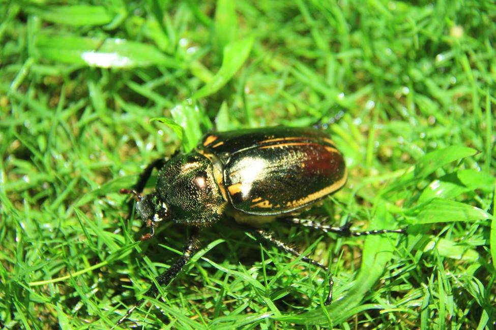 阳彩臂金龟身体呈现出光亮的金绿色,鞘翅大部分为黑色,有时带有暗铜绿色光泽
