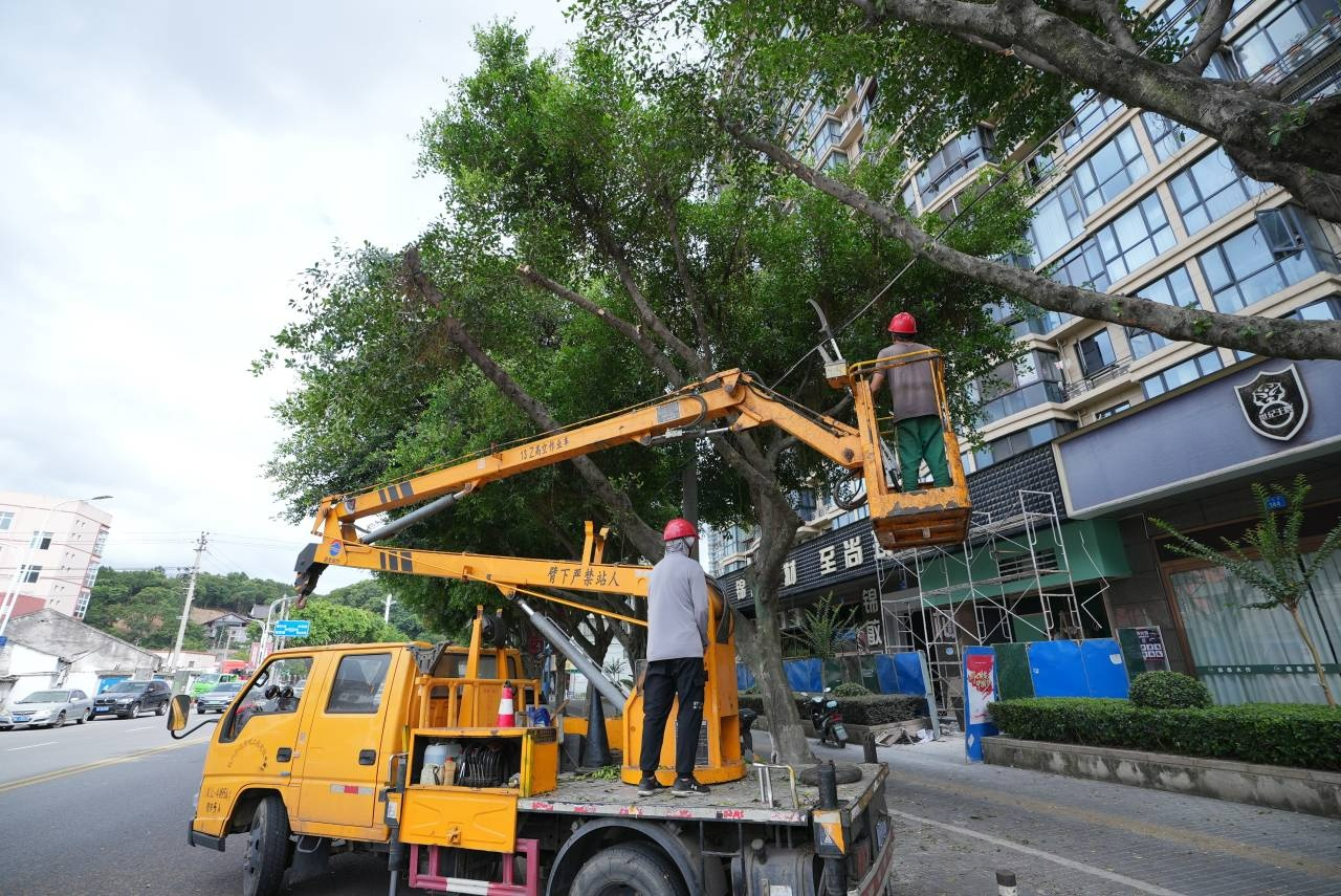 温州瑞安市区园林养护工人修剪加固树木(央广网发瑞安市融媒体中心供图)