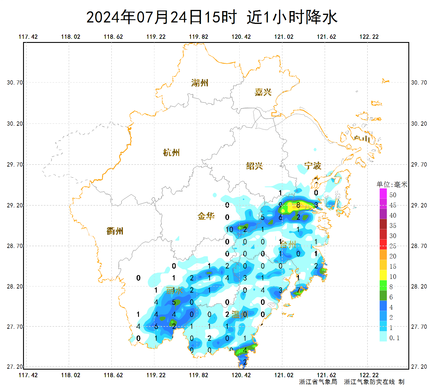 7月24日15时浙江省降水情况(央广网发浙江省气象局供图)