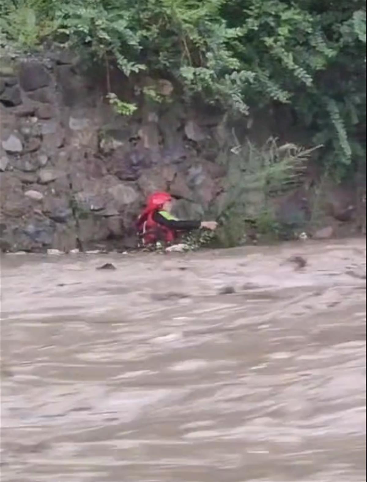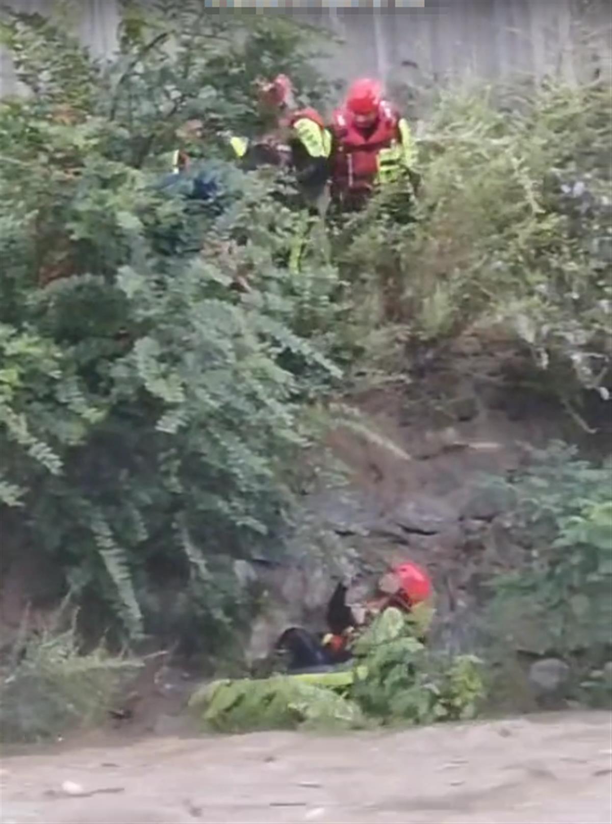消防员抓住江边的小树后停下来(网络视频截图)