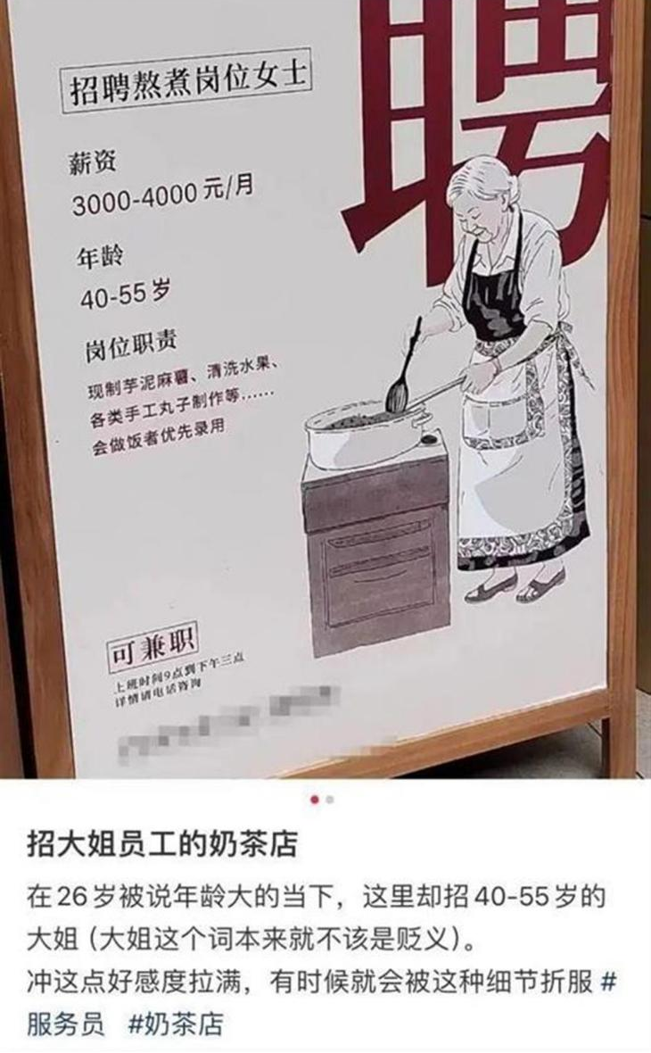 近日,安徽合肥,有网友在社交平台上发了一张奶茶店招聘图,并写道,在26岁被说年龄大的当下,这里却招40-55岁的大姐,冲这点好感度拉满。招聘图显示,该奶茶店招聘熬煮岗位女士,薪资3000-4000元/月,年龄40-55岁,岗位职责主要是现制芋泥麻薯,清洗水果,会做饭者优先录用。在图片下方还写着一行字,可兼职,上班时间九点到下午三点。