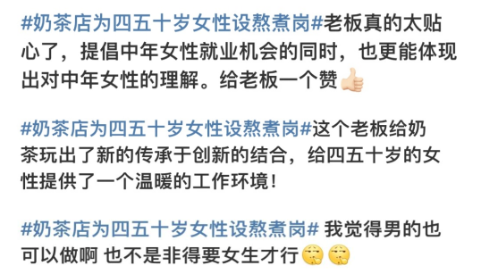 对于这一事件,部分网友持有赞赏的态度,纷纷夸奖老板对中年女性的就业困境的关心和理解;但也有部分网友对于熬煮岗位的招聘限制带有年龄和性别歧视提出了质疑。虽然有所争议,但整体反响积极,认同其人文关怀。