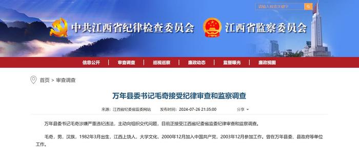 连日来,江西省上饶市万年县委书记毛奇被人网上实名举报涉嫌性侵女下属引发网络关注。上饶市委宣布立即成立联合调查组进行调查核实,调查情况将及时向社会公布。7月26日晚,据江西省纪委省监委网站消息,万年县委书记毛奇涉嫌严重违纪违法,主动向组织交代问题,目前正接受江西省纪委省监委纪律审查和监察调查。