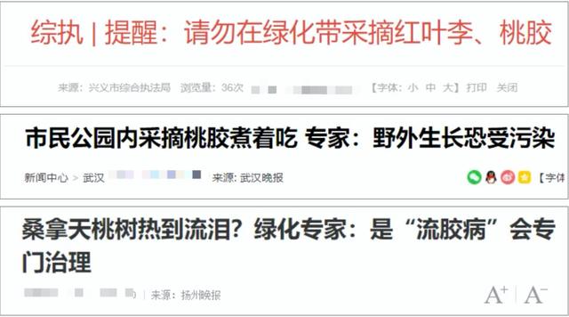 武汉市园林科学研究院植物保护研究所高级工程师董立坤曾表示,这种流胶不建议采食,一是因为雨后潮湿,会有很多霉菌感染;二是园林养护喷洒农药有可能污染。