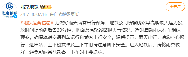 为做好雨天乘客出行保障,地铁公司所辖线路早高峰最大运力投放时间提前延后各30分钟,地面及高架线路视天气情况,适时启动雨天行车组织预案,确保轨道交通列车运行和乘客出行安全。