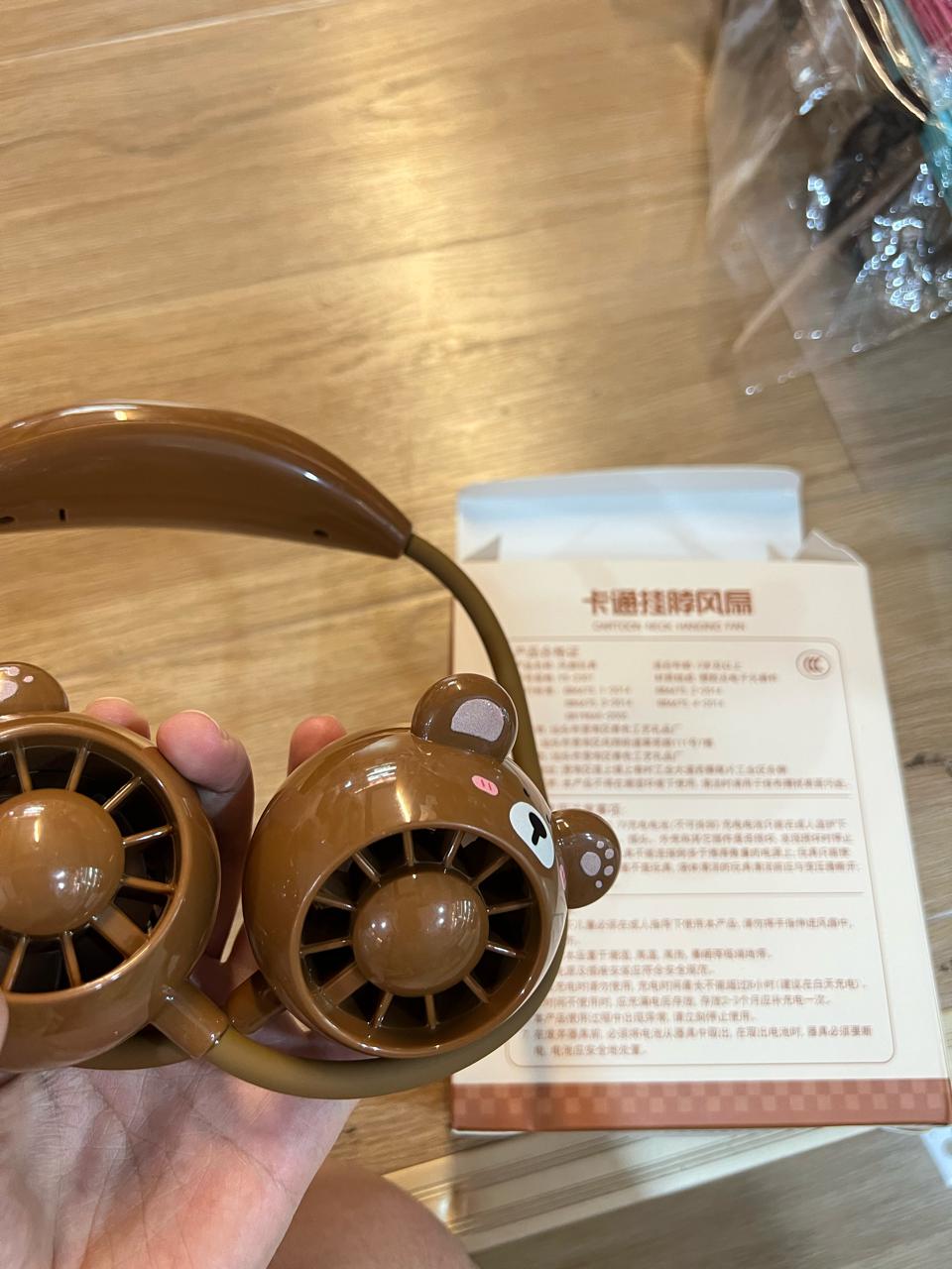 另一款30元的挂脖小风扇外形更为卡通,小风扇做成了卡通小熊的样子,有外包装盒,盒子上有3C标识,可以看到制造商、厂址、注意事项等信息。注意事项上有写明:10岁以下儿童必须在成年人指导下使用本产品;请勿将手指伸进风扇中,以免割伤。