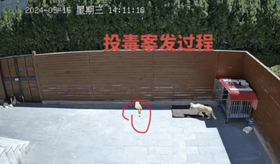 两只狗狗所在院子的监控画面显示,一名男子出现在其家院墙的外围,十几秒后从监控画面中消失。同时另一个监控画面显示,有毒的食物被从院墙的另一侧投掷到院中。