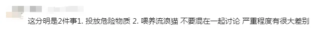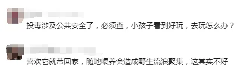 对于此类对猫狗投毒的事件,网友们也议论纷纷。有人认为喜欢流浪猫狗就应该将其带回家;有人谴责不管怎样都不应投毒,猫狗也是鲜活的生命,更何况投毒会危及公共安全;还有人指出,投喂流浪猫和投放危险物质是两件事,不应混为一谈。