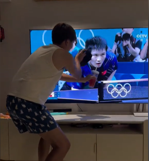 相关视频显示,该网友身穿白色背心、大裤衩,在电视机前对着比赛中的樊振东又是擦汗又是递果汁,口中还念着:“喝口水,加油啊!”“加油啊,兄弟!”其沉浸式观赛的状态引发诸多网友共鸣,大家先后晒出自己观赛时的紧张心情。
