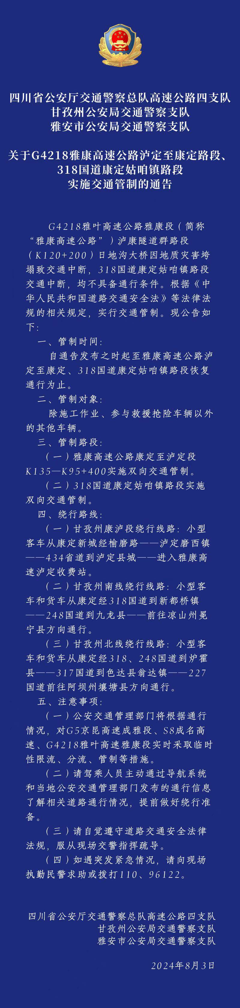 8月3日,封面新闻记者从四川省公安厅交警总队获悉,G4218雅叶高速公路雅康段(简称“雅康高速公路”)泸康隧道群路段(K120+200)日地沟大桥因地质灾害垮塌致交通中断,318国道康定姑咱镇路段交通中断,均不具备通行条件。根据《中华人民共和国道路交通安全法》等法律法规的相关规定,实行交通管制。