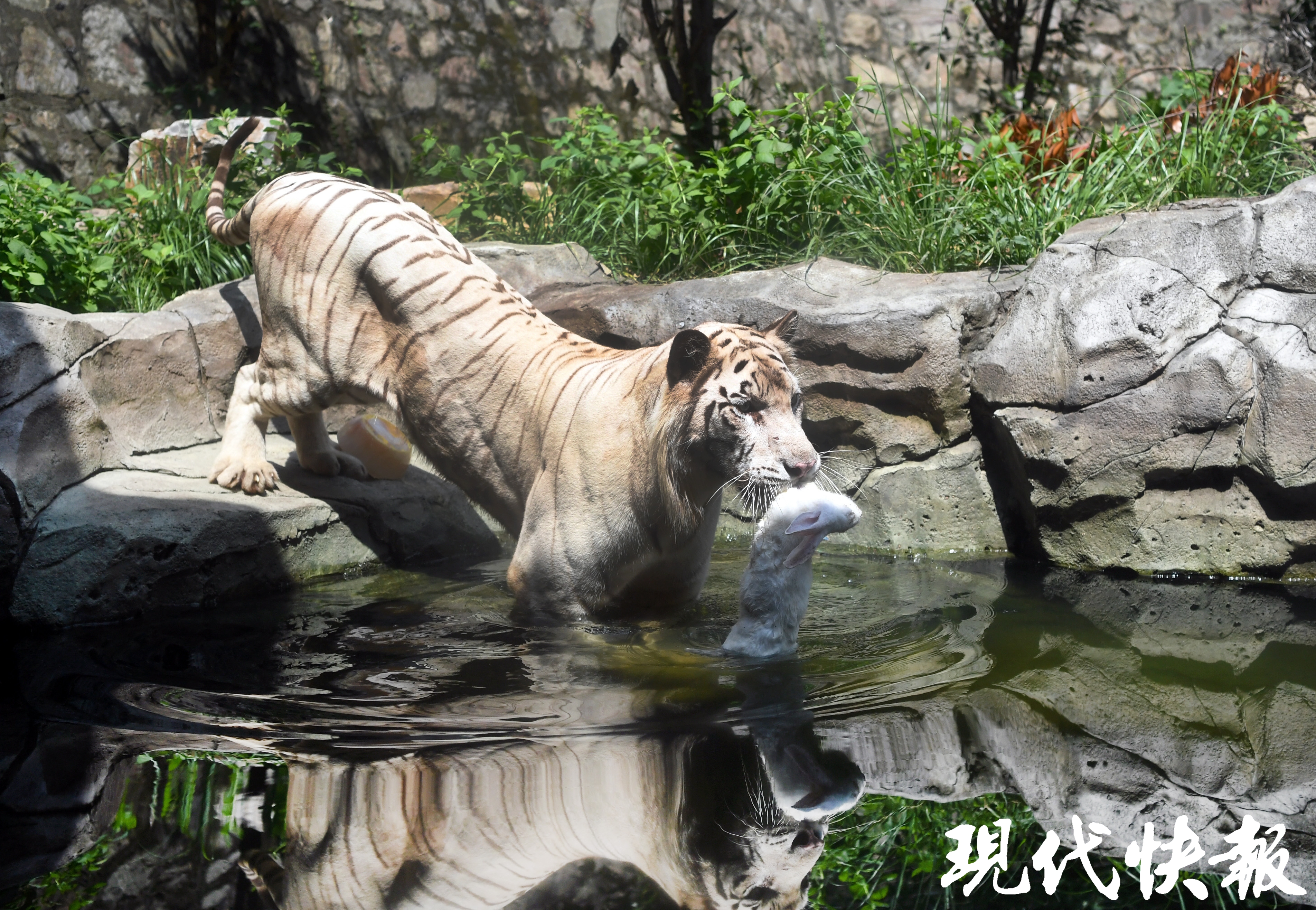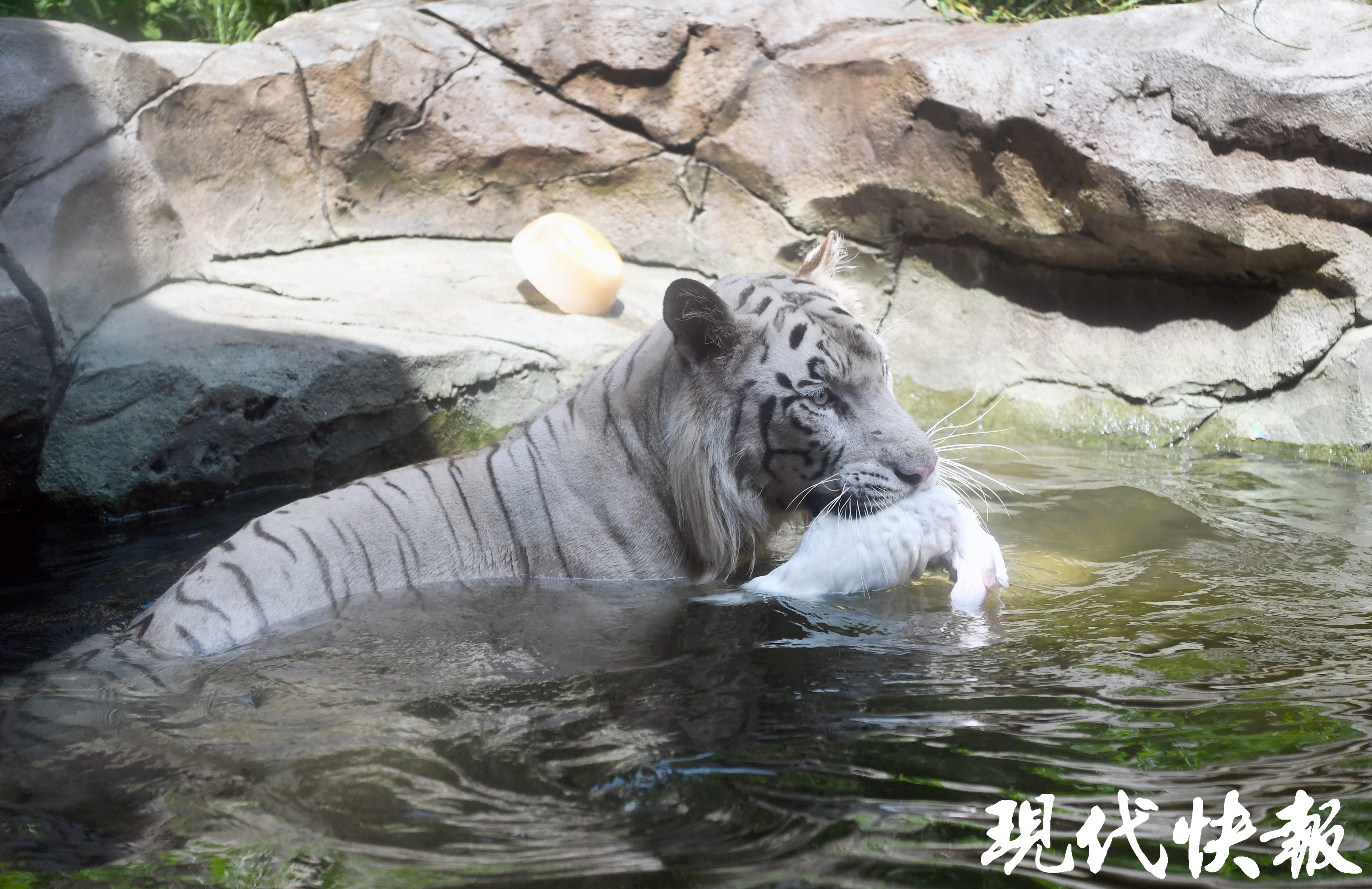 发给百兽之王的冰棍,自然是超大号的,晶莹剔透的圆饼形大冰块里藏着各种肉类。老虎泡在水中洗澡降温,显然它对完整的兔子肉更感兴趣一点,看来是把冰棍当作饭后甜品了。