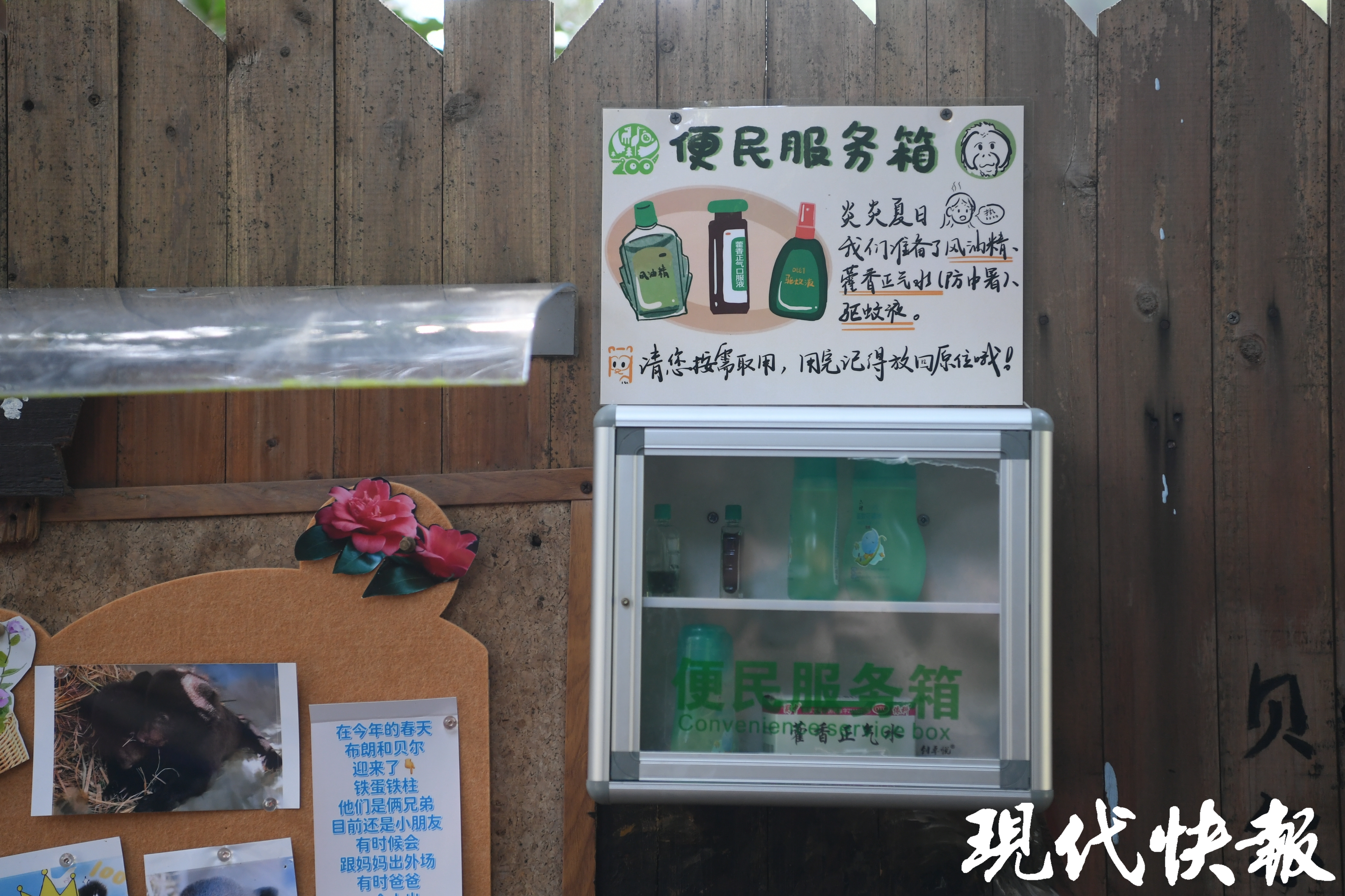 园方在大熊猫馆、本土物种保育区、中国猫科馆、高黎贡展区、亚洲灵长馆、冈瓦纳展区、犀鸟馆、熊馆八大场馆设置了“便民服务箱”,准备了风油精、藿香正气水、驱蚊液等药品,保障大家防暑应急药品的使用。