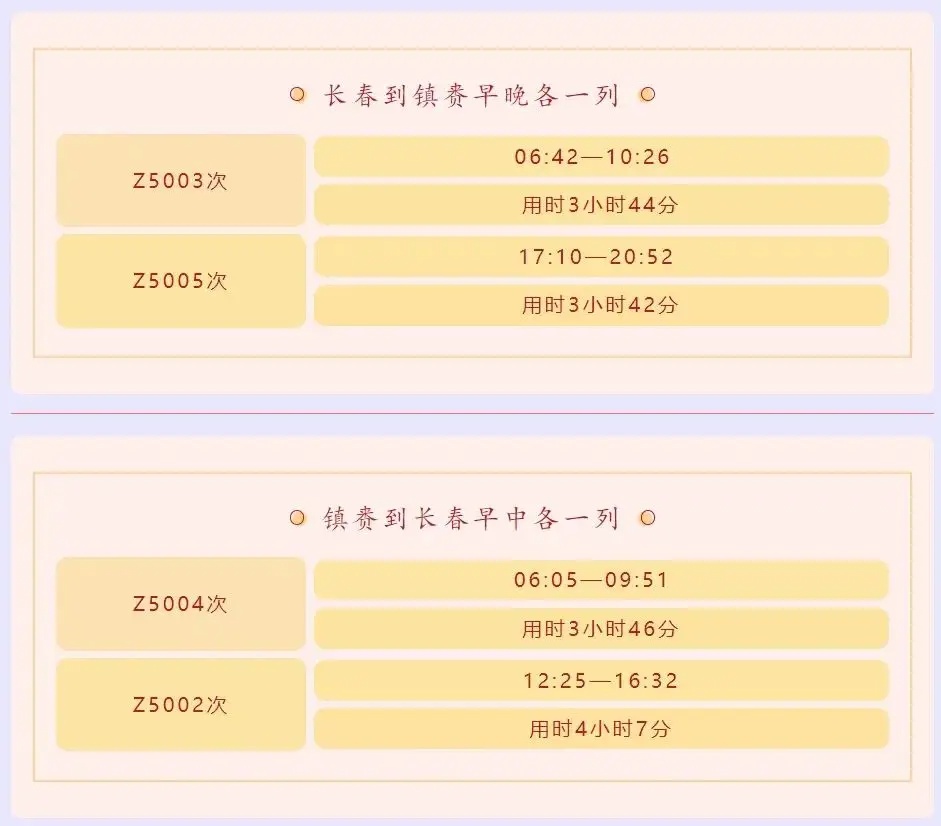 从铁路部门了解到,本次开通的“镇赉莫莫格号”共有2列客车,每天往返于镇赉和长春之间。镇赉到长春每天早中各一列,长春到镇赉每天早晚各一列,列车运行时速160公里。首发列车Z5002共有13节车厢,停靠白城、大安、松原、农安等6站,最终抵达长春站。