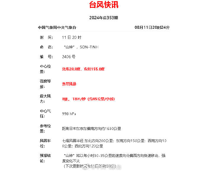 新京报讯 据@中央气象台 消息,今年第6号台风“山神”(热带风暴级,英文名称:Son-Tinh;名字来源:越南;名字意义:山神)已于今天(8月11日)晚上在西北太平洋洋面生成,晚上8点钟其中心位于日本东京东偏南方向约1630公里的洋面上,8级(18米/秒),七级风圈半径100-200公里。