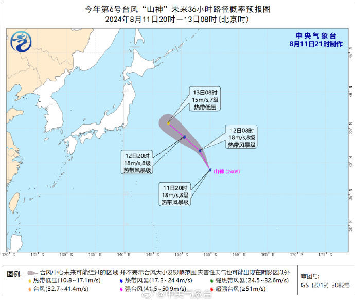 预计,“山神”将以每小时30-35公里的速度向北偏西转西北方向快速移动,强度变化不大,逐渐向日本以东洋面靠近,之后在日本以东洋面逐渐减弱消散,未来对我国海域无影响。
