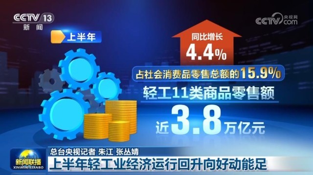 在消费端,上半年,轻工11类商品零售额近3.8万亿元,占社会消费品零售总额的15.9%,同比增长4.4%。