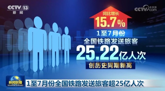 记者从国铁集团获悉,今年以来铁路运输市场供需两旺,1至7月份,全国铁路发送旅客25.22亿人次,同比增长15.7%,创历史同期新高。