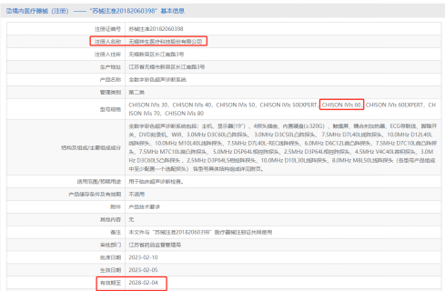 记者查询了国家药品监督管理局官网,祥生iVis60医疗器械注册证产品名称为“全数字彩色超声诊断系统”,管理类别属“第二类”(医疗器械)。