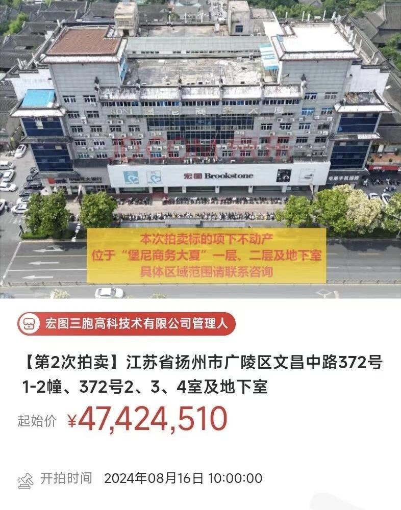 2023年2月,由于不能清偿到期债务且资不抵债,宏图三胞被法院裁定受理破产清算。8月14日,现代快报记者了解到,宏图三胞名下三处不动产将于8月16日被二次拍卖,总起拍价6600多万元。