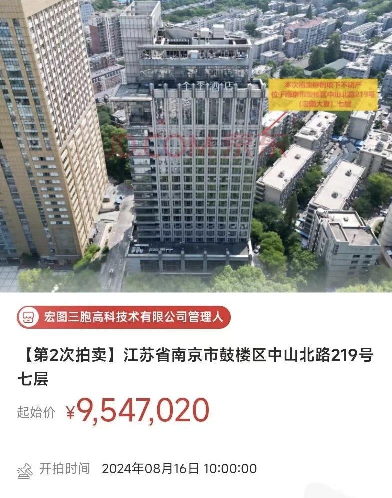 拍卖标的1是宏图三胞名下坐落于南京市鼓楼中山北路219号七层的不动产,面积1032.28平方米,第2次拍卖起拍价954.702万元;拍卖标的2是宏图三胞名下坐落于南京市鼓楼中山北路219号八层的不动产,面积1032.28平方米,第2次拍卖起拍价919.548万元;拍卖标的3是宏图三胞名下坐落于扬州市广陵区文昌中路372号1-2幢、372号2、3、4室及地下室的不动产,面积5070.31平方米,第2次拍卖起拍价4742.451万元。截至8月14日16时,共有265人次围观,33人设置关注提醒,但0人报名。