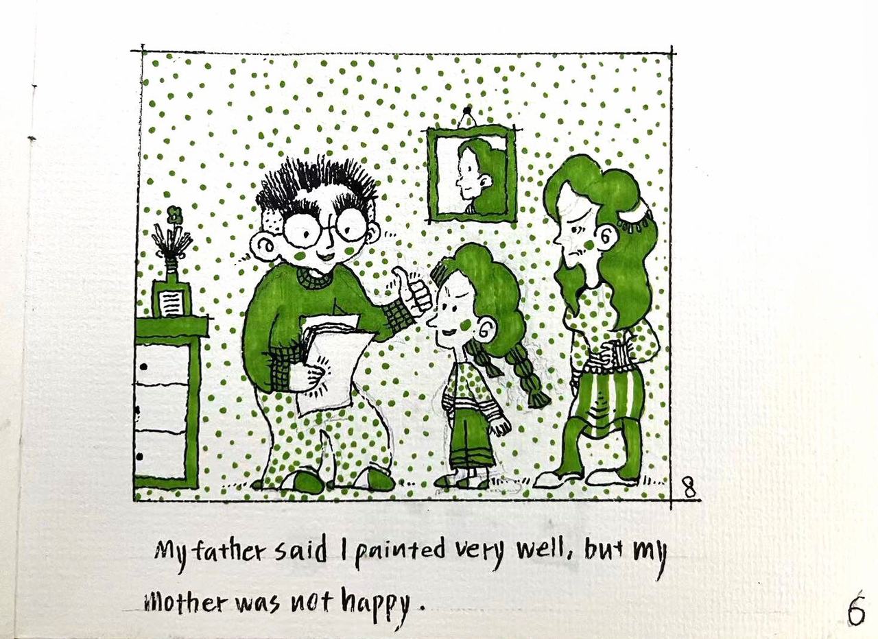 “我的微信头像就是她画的。”子乔爸爸笑着表示,到了6岁女儿已经尝试创作卡通形象绘本。“她有个绘本以我们一家三口为原型,作为纪念,我就把男主人的形象截出来当头像用了。”