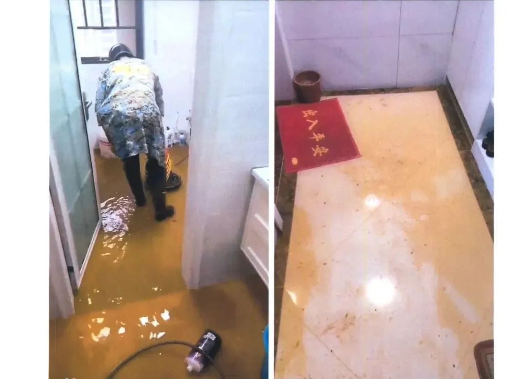 △ 物业公司保洁人员帮助6栋904室业主清理室内污水