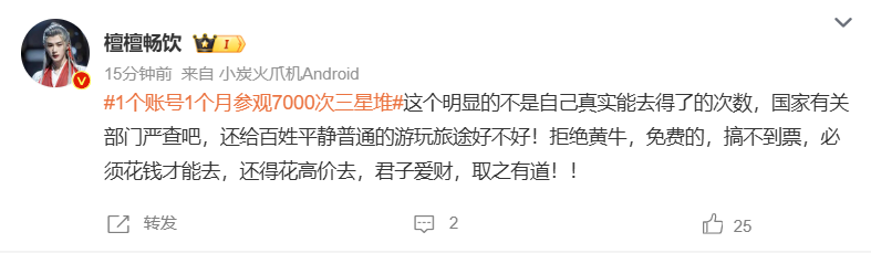 “1个账号1个月参观7000次三星堆”的词条上了微博热搜。从三星堆博物馆官方发布的图片中我们可以清楚地看到,有部分账号短短一个月的时间就参观了七千多次。如此令人瞠目结舌的数据!是账号的主人如此热爱历史吗?显然不是。这七千多次的参观,是“黄牛”为了谋利而挤占公众资源,为了私利而糟蹋游客的出行体验。