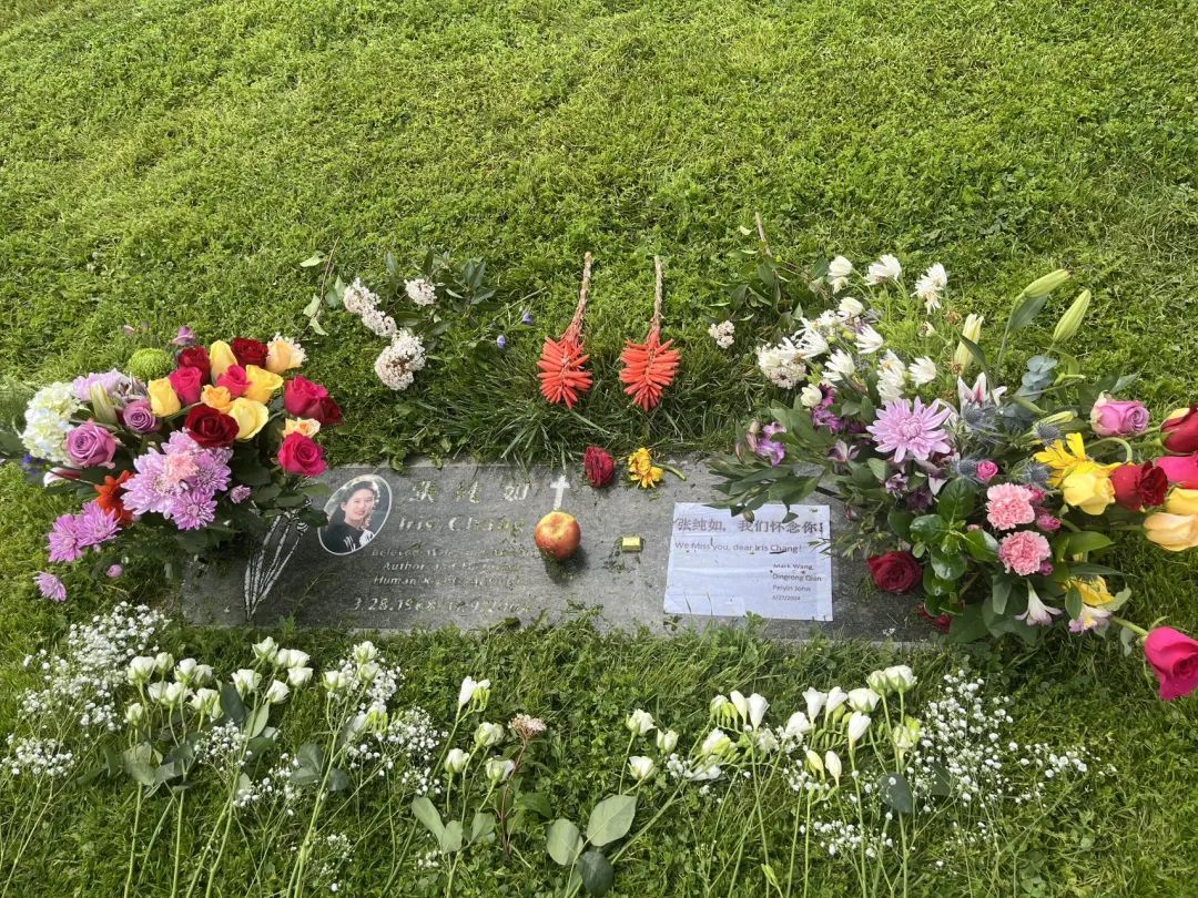 被鲜花包围的张纯如墓碑(摄影:LilyYao么丽,来源:张纯如公园义工群)