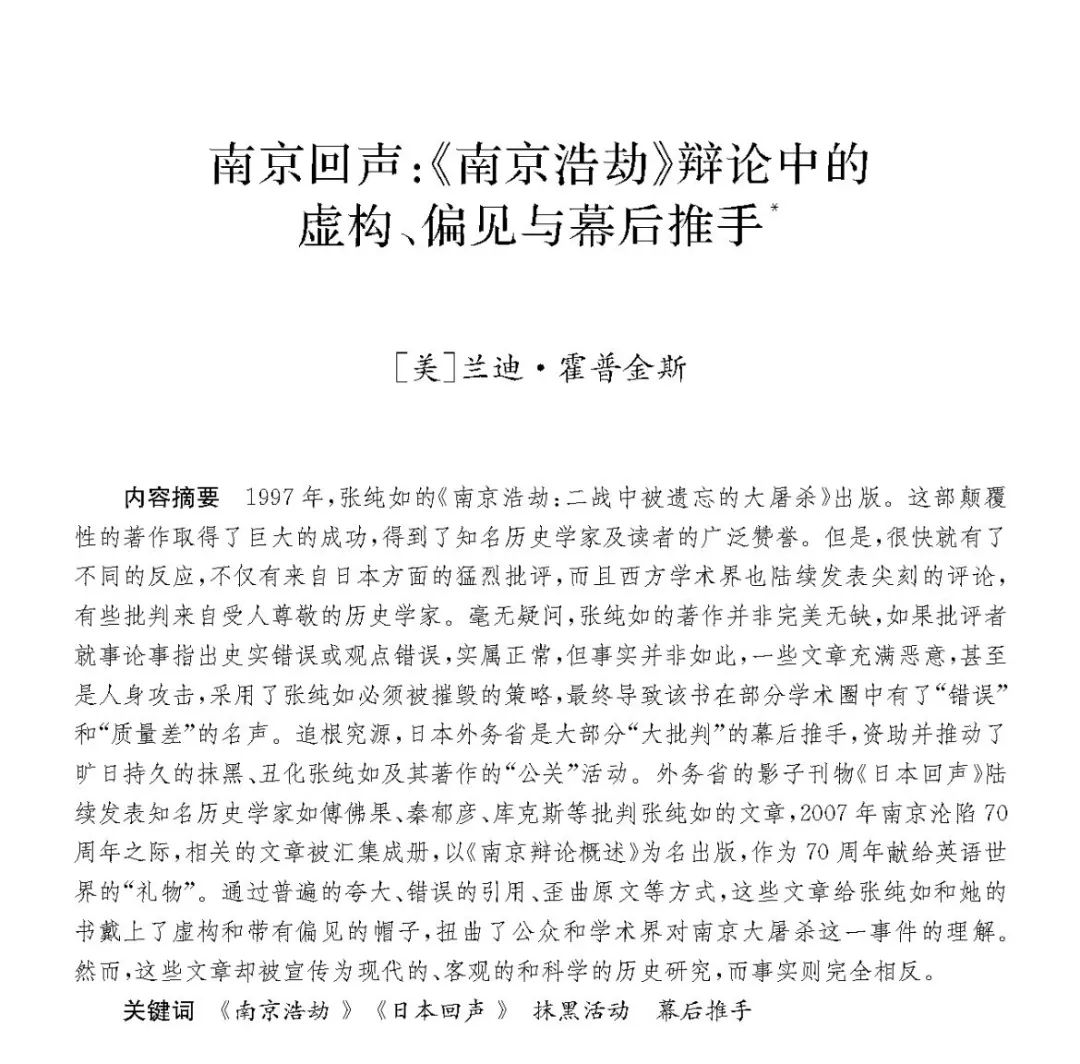 近期,美国波特兰州立大学历史系顾问兰迪·霍普金斯的论文《南京回声:<南京浩劫>辩论中的虚构、偏见与幕后推手》(以下简称《南京回声》)在我馆期刊《日本侵华南京大屠杀研究》上发表。该论文揭露了一场针对张纯如的诋毁运动,追根究源,日本外务省是大部分“大批判”的幕后推手,资助并推动了旷日持久的抹黑、丑化张纯如及其著作的“公关”活动。该论文刊出不久,澎湃新闻、《中国现代史》全文转载,获得海内外广泛关注。