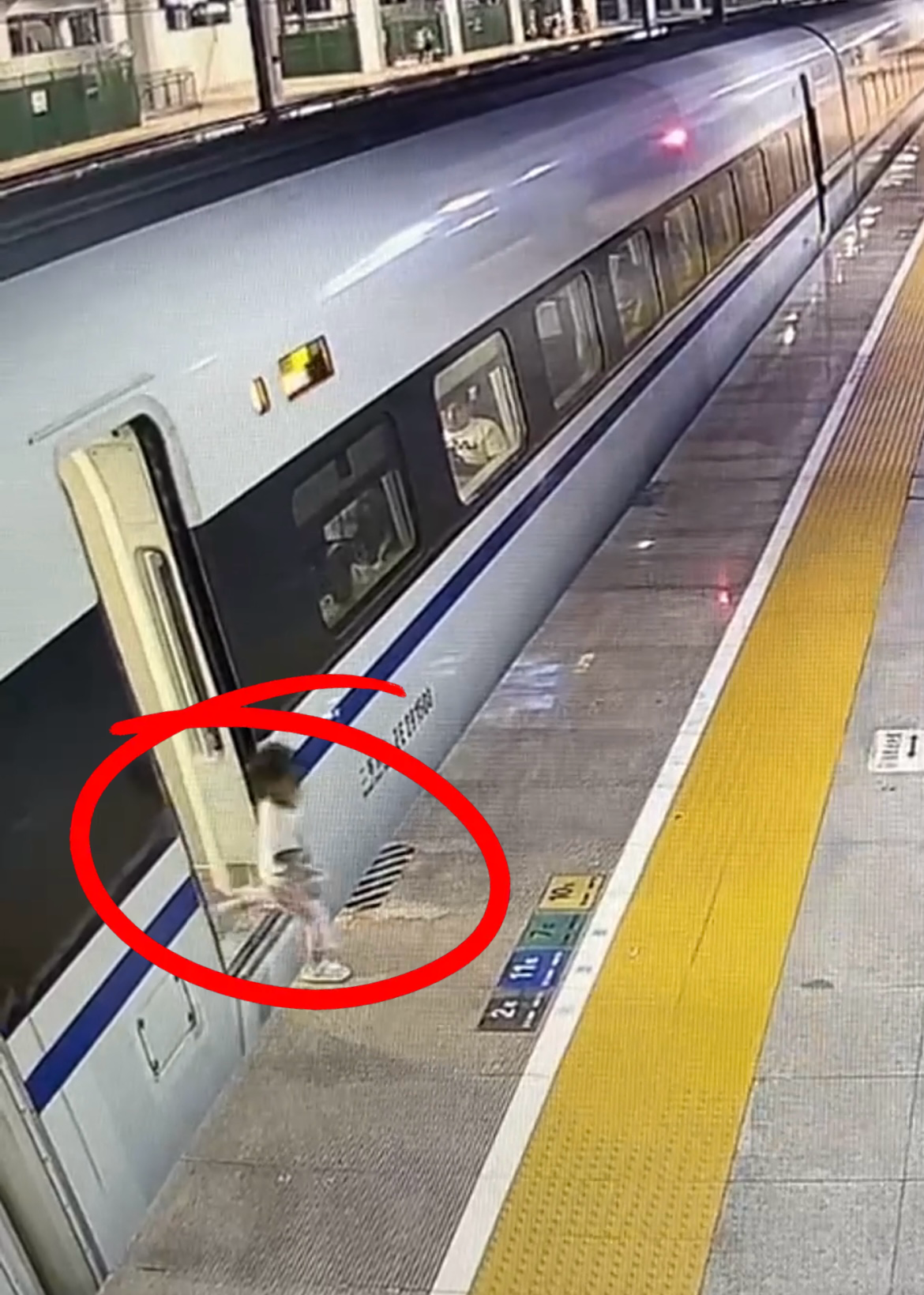 千钧一发之际,正在站台上的客运员崔登辉一个健步冲上去抱住孩子。孩子的母亲试图下车将孩子抱回,然而此时车门关闭,列车启动。