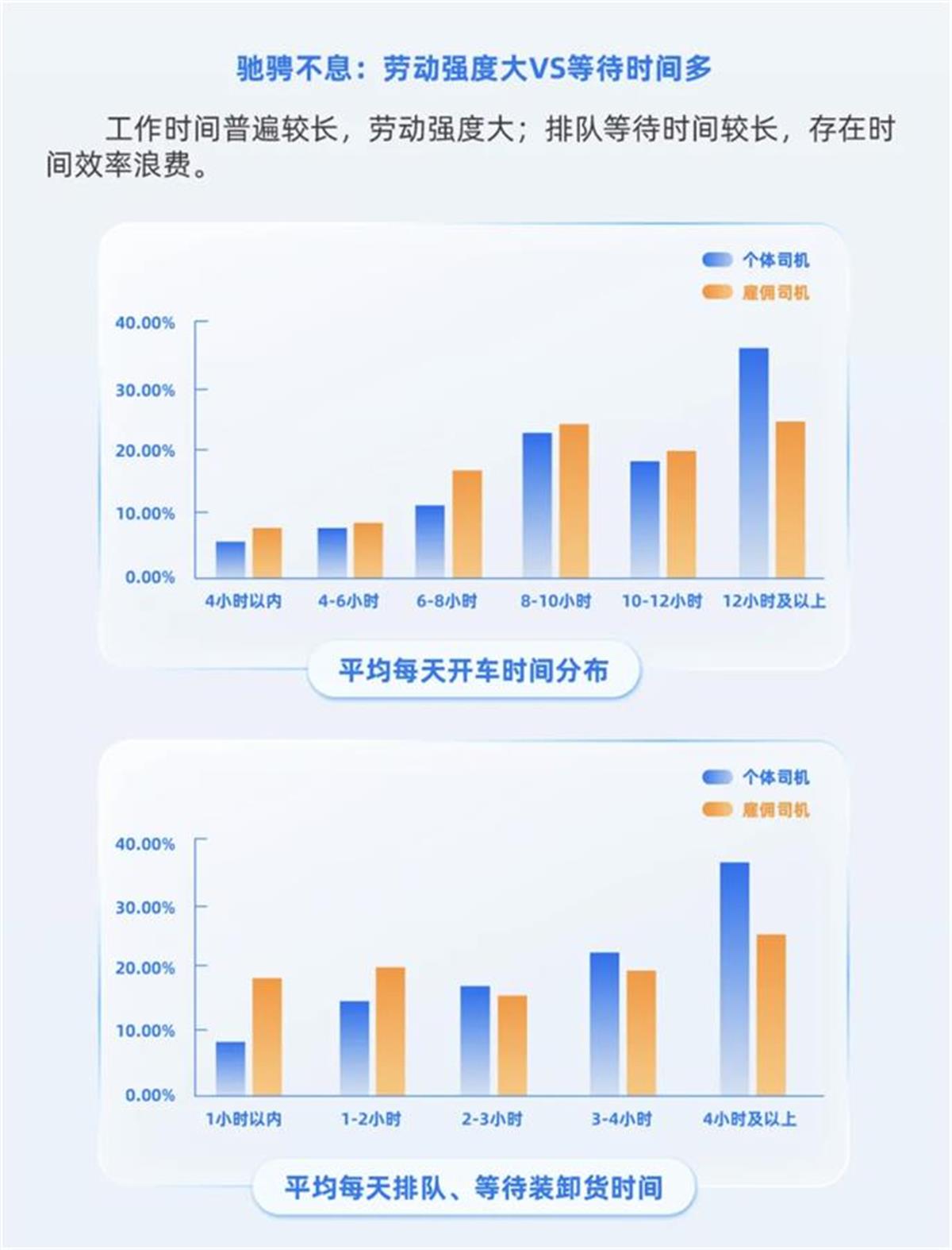 上述报告还显示,货车司机工作时间普遍较长,个体司机和受雇司机每天开车10小时及以上的分别占比52.89%、43.36%,其中开车时间12小时及以上的分别占34.99%、24.24%。个体司机较受雇司机驾驶时间总体更长,劳动强度大。