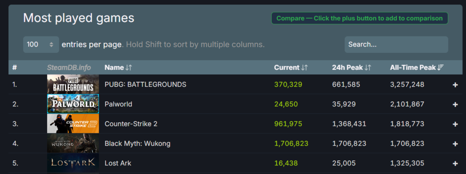 据第三方网站SteamDB统计,中午12点,《黑神话:悟空》在大型游戏平台Steam的同时在线人数突破了100万;下午1点,突破了140万;晚上7点,则突破了170万。目前《黑神话:悟空》的排名已超越《失落的方舟》和《DOTA2》,进入了在线人数榜单的历史第四位,是前十榜单中唯一的国产游戏,也是排名最高的非联机游戏。