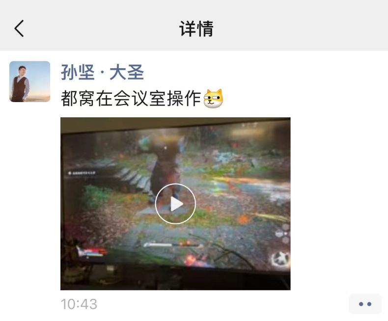 也有一部分老板将办公时间开放给员工游玩《黑神话:悟空》。上午10点43分,杭州纳视文化创意有限公司董事长孙坚发了一条朋友圈视频,记录了团队伙伴在公司会议室用游戏主机PS5进行游玩的画面。