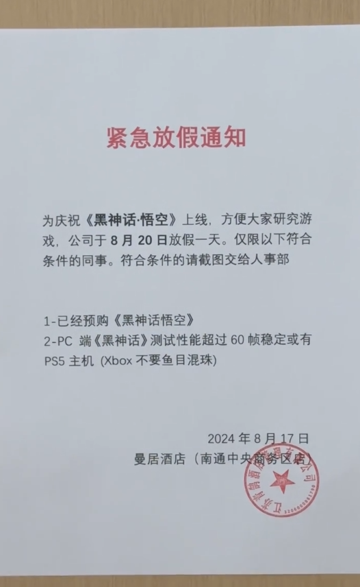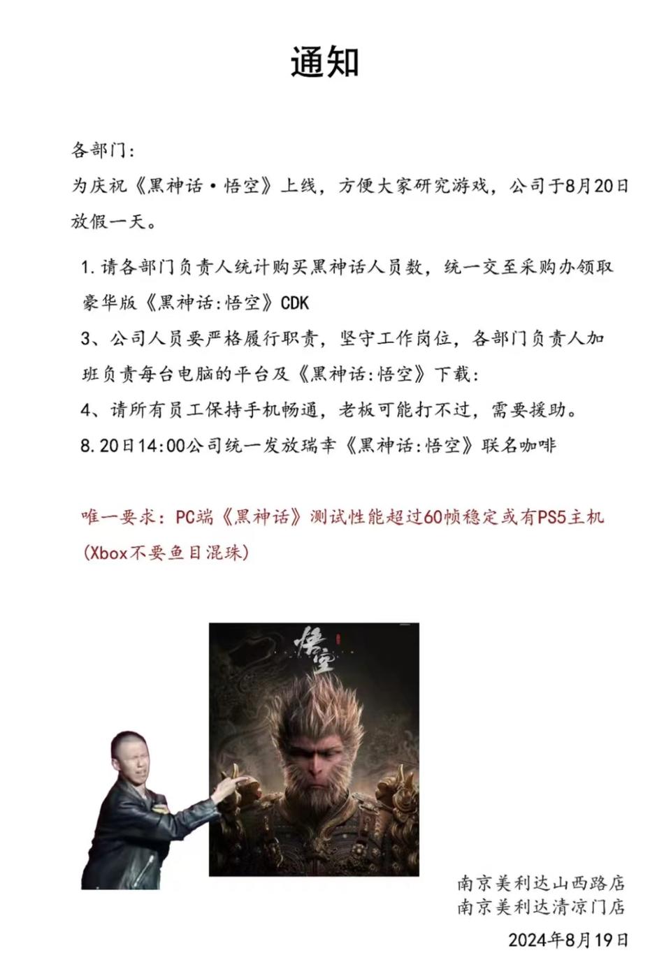 “为庆祝《黑神话:悟空》上线,方便大家研究游戏,公司于8月20日放假一天。”有这样一张放假通知在互联网上流传,记者采访到了该通知落款处南京美利达自行车山西路店的江经理,他向记者确认了这张通知的真实性。