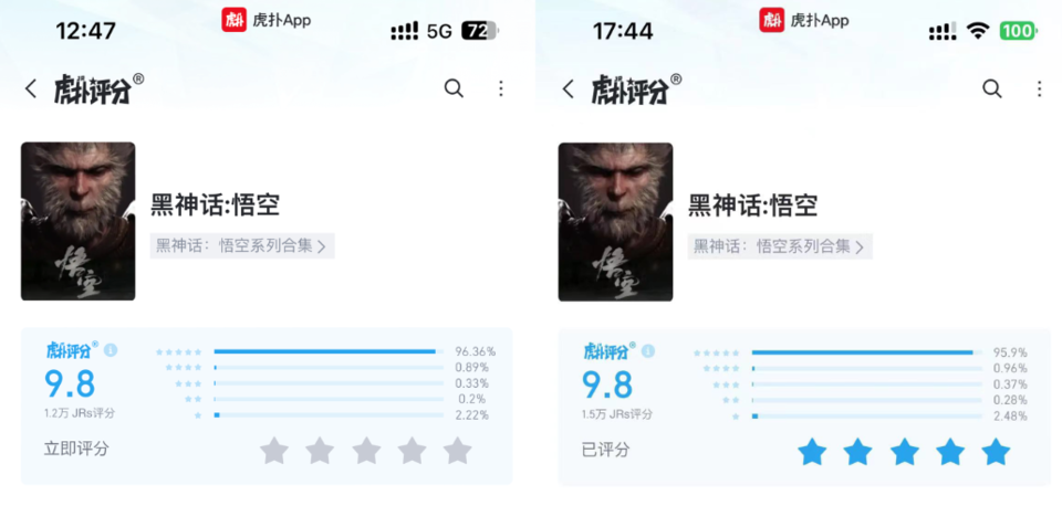 12点47分,在网络论坛“虎扑”的打分板块,《黑神话:悟空》的总体评分为9.8分,在1.2万人的评分中,超过96%的用户给出了满分评价。约5个小时之后,评价人数涨到了1.5万人,评分依然维持在9.8分。