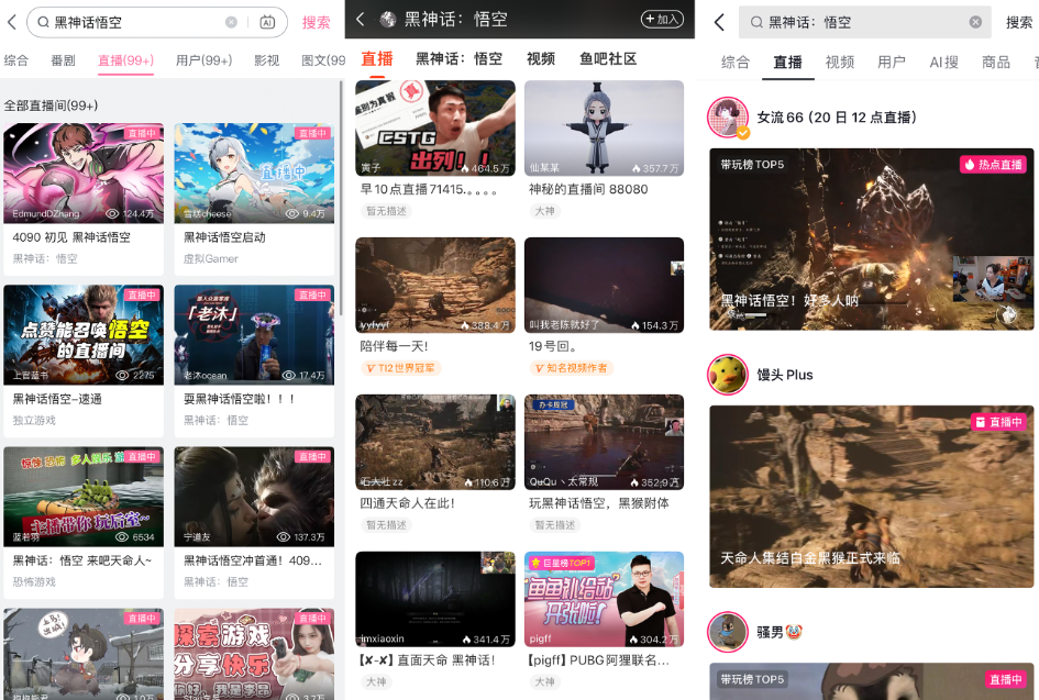 此时,多个游戏直播平台已被《黑神话:悟空》“攻陷”。斗鱼App搜索《黑神话:悟空》,相关直播间超过2000个,B站的首页推荐里轮番闪动着《黑神话:悟空》的宣传图,抖音、微博等平台热榜中,也有着不止一条《黑神话:悟空》相关话题。