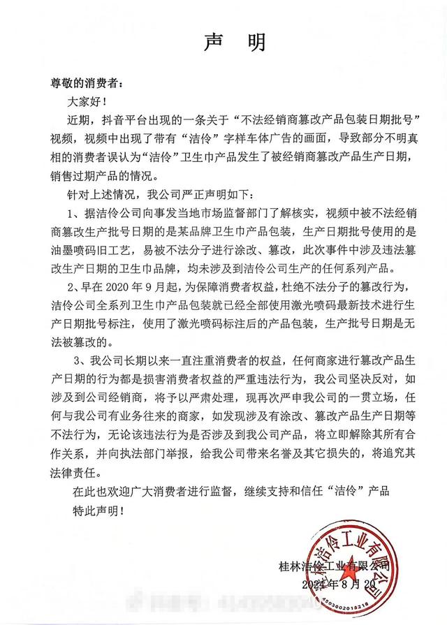 8月20日下午,洁伶品牌官方账号发布声明称,据洁伶公司向事发当地市场监督部门了解核实,视频中被不法经销商篡改生产批号日期的是某品牌卫生巾产品包装,生产日期批号使用的是油墨喷码旧工艺,易被不法分子进行涂改、篡改,此次事件中涉及违法改生产日期的卫生巾品牌,均未涉及到洁伶公司生产的任何系列产品。