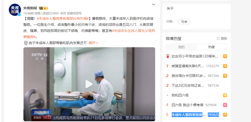 于是乎,割双眼皮、隆鼻、打美容针……形形色色的医美整形项目出现在未成年人的暑假清单中。在多个社交平台、短视频App上,“暑假整容”“暑假变美”等成为每年暑假的热门话题。
