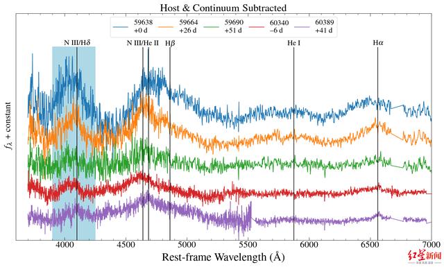 有意思的是,本次耀发的光谱与第一次耀发的光谱具有极其相似的、指示恒星内部核合成元素超丰的发射线特征,这表明两次耀发的吸积物质很有可能来源于同一颗恒星,从而给出重复性撕裂TDE的关键证据。